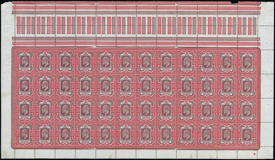 10d. dull reddish purple and carmine, pane of forty-eight (12x4) showing date cuts and coloured dot at foot, unmounted mint except for the lower row which has been partly strengthened by hinges; a few minor wrinkles, excellent colour and a rare multiple. Specialised M44 (6). Photo