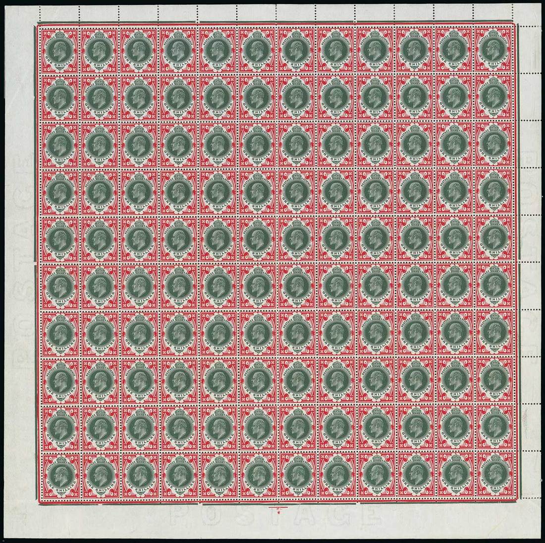 1/- green and carmine, complete lower pane of 120 (12x10), showing date cuts under the last stamp, showing the substitution of the South West corner section of twenty stamps [R16/1-20/4] by head plate 1, including the plate cut under [R20/2], varieties including "Break in Crown and damaged "e" (M47g), Scratch behind ear [R20/11] and other minor plate flaws, unmounted mint, hinged in the margins, a few light creases or gum creases as to be expected with such a multiple. A stunning and almost certainly unique item. Specialised M47 (5), £16,800 as singles. Photo