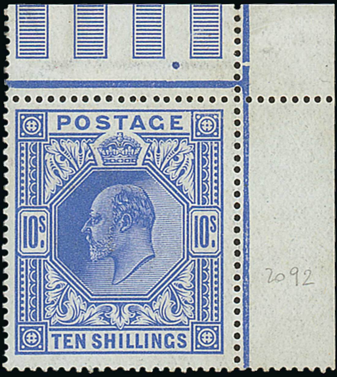 10/- deep blue, unmounted mint from the upper right corner of the sheet and showing plate dot in the margin, unmounted mint, hinged in the margin and small gum wrinkle; fine. Specialised M54 (3), £2,300. Photo