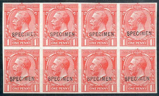 1912-24 Watermark Royal Cypher 1d. red, imperforate block of eight (4x2) overprinted "specimen" type 26, unmounted mint, tiny wrinkles, fine. Specialised N16u, £720+. Photo