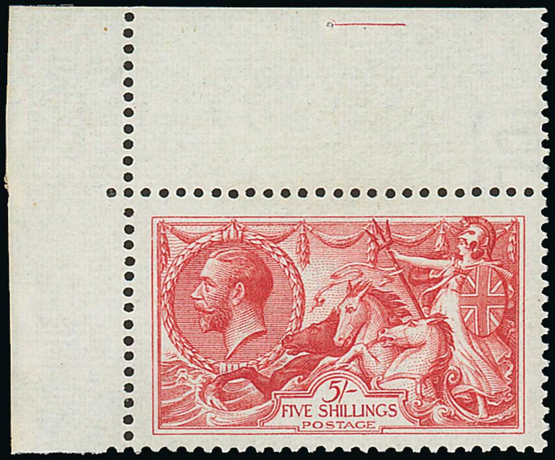 5/- rose-carmine, unmounted mint from the upper left corner of the sheet (hinged in the margin); slight wrinkles, fine and fresh. Specialised N68(1), £550. Photo