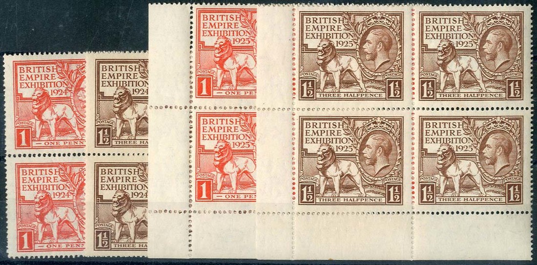 1924 and 1925 Wembley sets in unmounted mint blocks of four, a few split perfs. and two of the 1924 1d. with gum bends; fine. S.G. 430-433, £440+