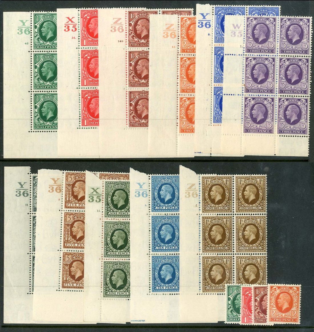 1934-36 Photogravure ½d. to 1/-, the set in Control and cylinder number blocks of six (2x3) from the lower left corners of the sheets, unmounted mint, two hinged in the margin, fine. Also ½d. to 2d. watermark sideways, fine unmounted mint. S.G. 439-449, £677+.