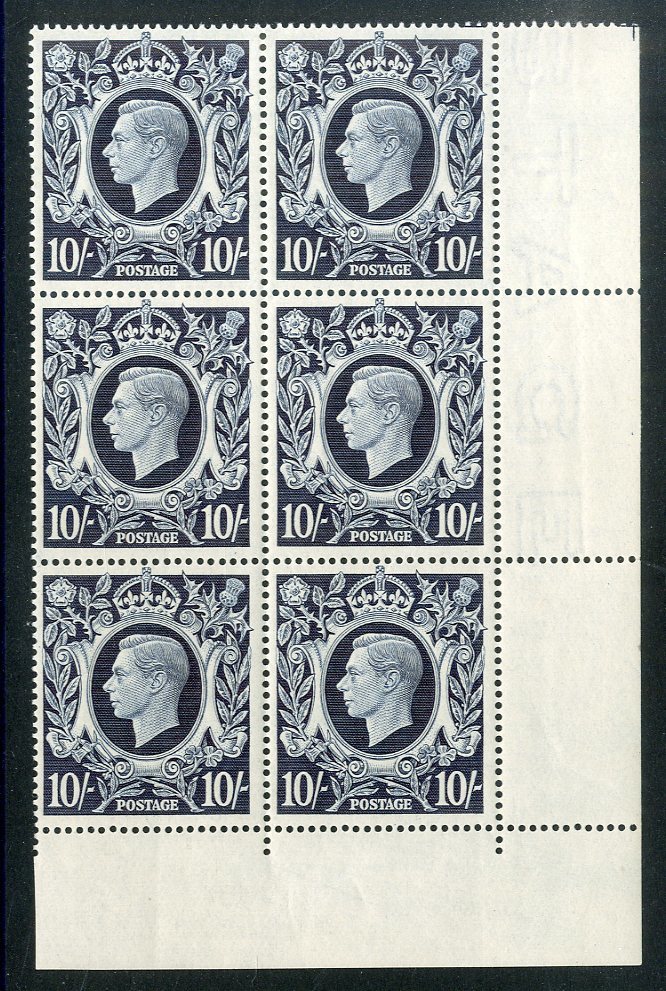 1939-48 10/- dark blue, block of six (2x3) from the lower right corner of the sheet, 1940 Stamp Centenary set in Control and plate number blocks of eight (2x4), 1951 Festival 2/6d. to £1, unmounted mint except for two in the Centenary sets; fine. Cat. £1,730