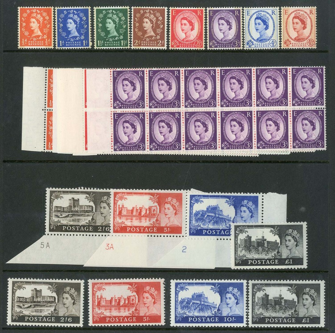 1957 graphite ½d. to 3d. in blocks of twelve (6x2), 1959-68 Bradbury, Wilkinson 2/6d. to £1, 1959 phosphor-graphite set, 1967-68 2/6d. to £1, unmounted mint, fine. Cat. £298