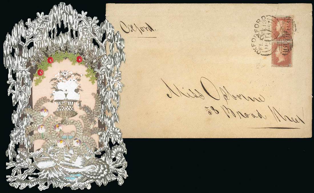 1857 (13 Feb.) plain envelope (with peripheral faults) bearing 1854-57 1d. (pair) tied by two Oxford sideways duplex cancellations, containing ornate die-cut Valentines card, partly handcoloured, and sixteen line love poem. Attractive and fine. Photo