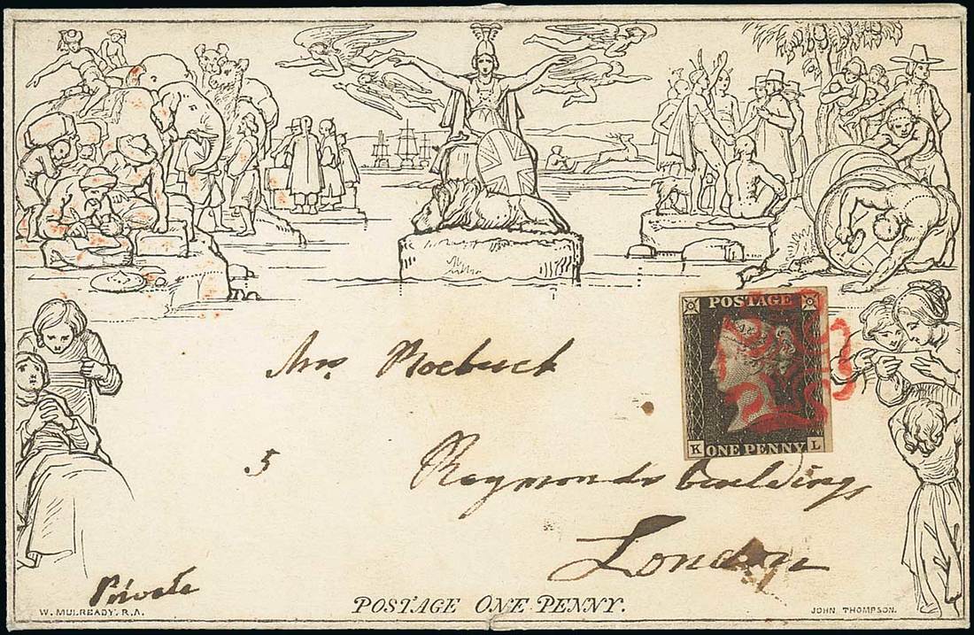 A2, dated 15 June 1840, from Bath to London, additionally bearing 1840 1d. Black, Plate III, KL, touched at foot but with good to large margins other sides, and tied by a crisp red Maltese Cross in a crimson shade, dated markings on reverse; clean and uncreased. Fine and extremely rare with the Penny Black tied by a Maltese Cross but Britannia not so (contrary to Post Office instructions). B.P.A. Certificate (2010). Specialised £15,000. Photo