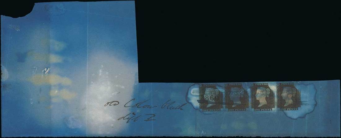 1d. "Rainbow" Colour trial, State 2, in deep lilac-brown on unwatermarked white wove paper, dipped in Prussiate of Potash, horizontal strip of four, the lower row of the sheet, with good margins at top and extra wide margins the other three sides, the first cancelled "A860", endorsed Old Colour Black/dipt P; some creases and the second stamp with fault. A spectacular piece and extremely rare. Specialised DP20a. Photo