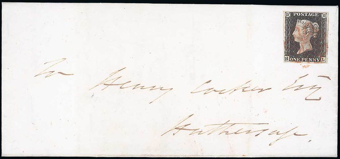 HL good margins all round, tied by red Maltese Cross cancellation to entire letter dated 12 May 1840 from Sheffield with red datestamp on reverse; light vertical filing fold well clear of the adhesive, fine and scarce early usage. Specialised A1tf, £3,500. Photo