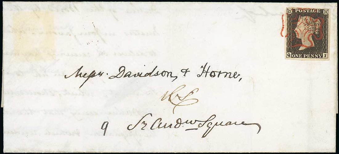 QI a lovely delicate impression with good to very large margins all round, tied by a crisp and upright red Maltese Cross cancellation to entire letter, dated 18 May 1840 with dated marking on reverse; light vertical bend affecting the adhesive. Fine. Specialised A1th, £2,800. Photo