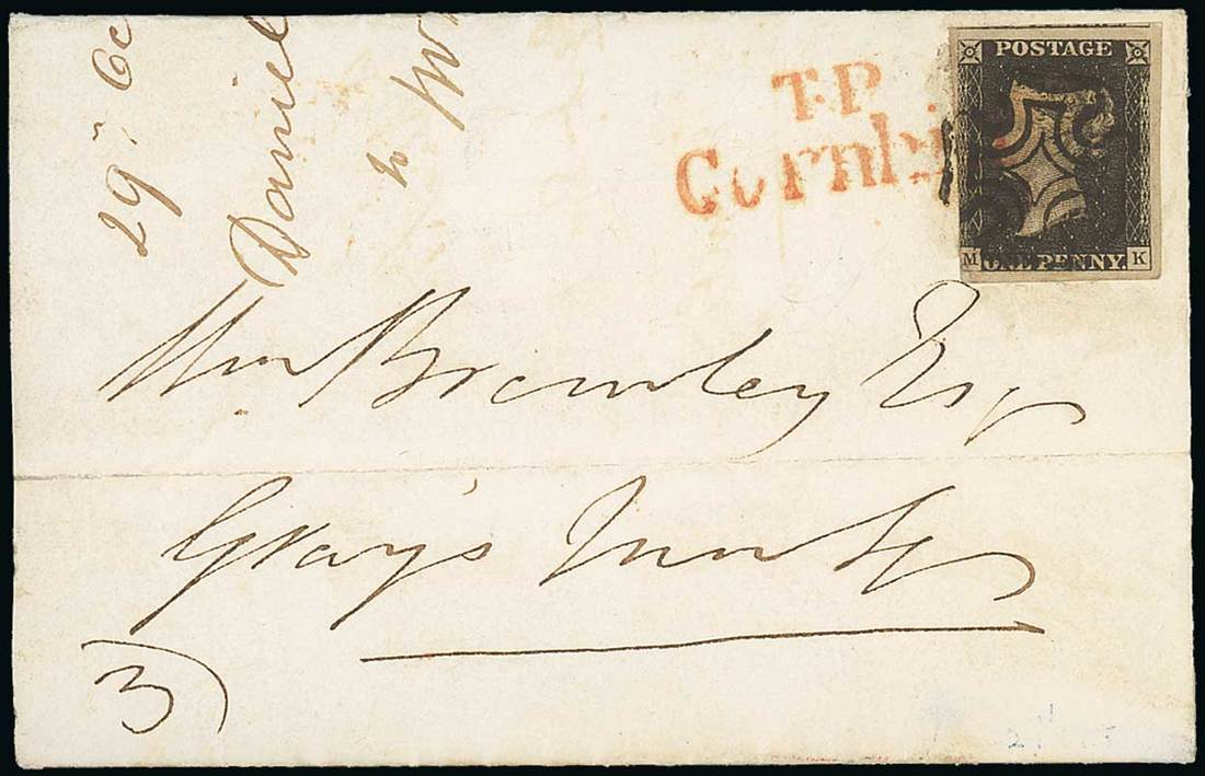 MK non coincident re-entry, shaved at left, large margins other sides and showing a portion of the adjoining stamp at top, tied to entire letter, dated 29 Oct. 1840 to Grays Inn, by superb, upright, experimental black Maltese Cross and red "T.P./Cornhill" unusually cancelling the stamp; horizontal filing fold and a trifle soiled. Scarce. Photo