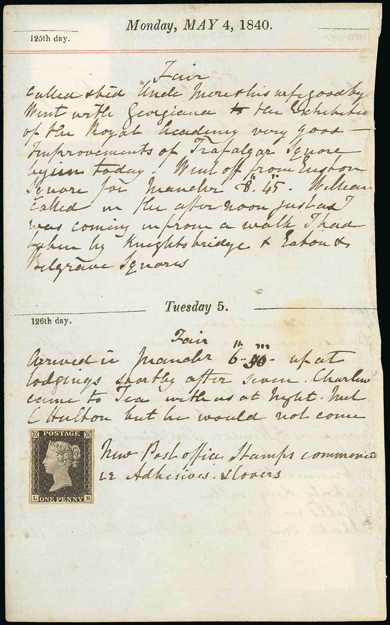 AL, uncancelled and with good balanced margins all round, affixed to page from 1840 day-to-day diary, dated "Monday, MAY 4, 1840" and "Tuesday 5" with manuscript entry for that day including "New Post office stamps commenced, ie Adhesives & Covers". Very fine and an important historical item. Although the new adhesive postage stamps were valid for use from May 6 1840 the 1d. stamps were put on sale from 1 May. B.P.A. Certificate (2017). Photo