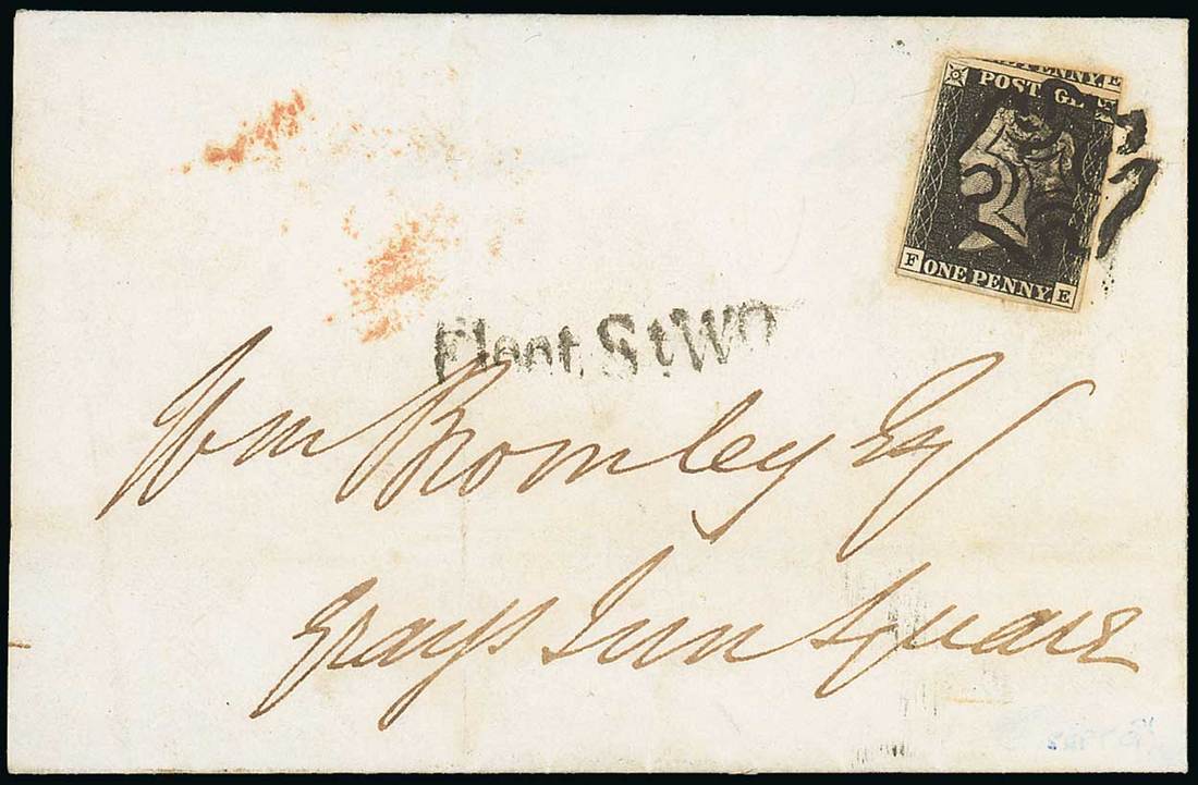 FE shaved at right, good to very large margins other sides and showing a portion of the adjoining stamp at top, tied by a crisp experimental black Maltese Cross cancellation to entire letter, dated 9 Sept. 1840, from Temple to Grays Inn Square, with Fleet St. WO receiving house marking alongside; filing folds clear of the adhesive. The 10th. day of use of the experimental black Maltese Cross. Photo