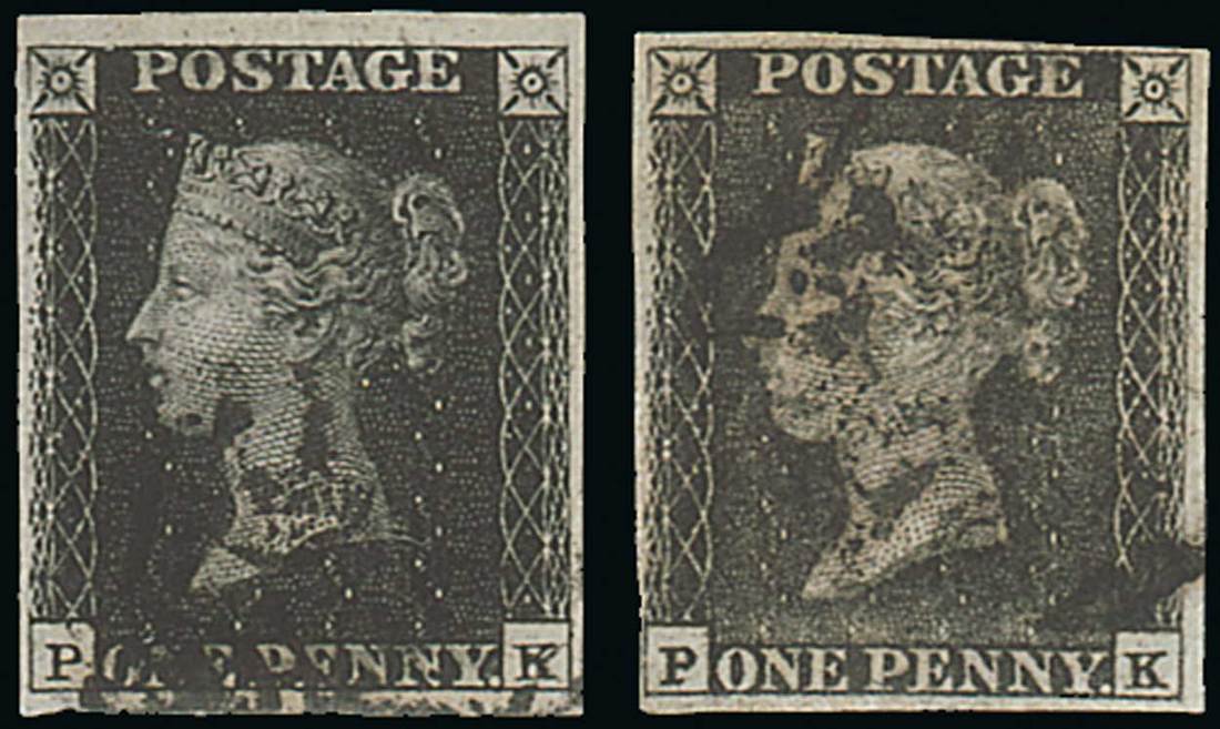 PK intense black shade, good to large margins all round, black Maltese Cross cancellation, fine. Also a similarly lettered example from this Plate but an unlisted distinctly grey-black worn impression, close to good margins, black Maltese Cross cancellation; fine. A striking pair. Photo