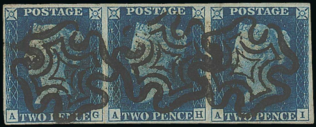 AG-AI horizontal strip of three, large margins all round, three crisp black Maltese Cross cancellations, deep colour and fine appearance but filled thins. Photo