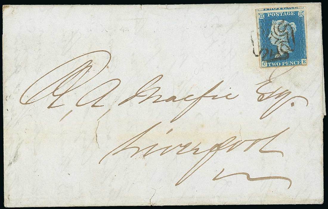 CE pale blue shade, touched at lower right but showing portions of three adjoining stamps, tied to entire letter dated Oct. 1 1842 to Liverpool by a good strike of the distinctive Maltese Cross cancellation of Greenock, boxed datestamp on reverse; the entire with small tear at foot and a few minor perimeter faults. Fine. Specialised DS6va, £7,500. Photo