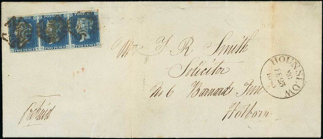GB-GD horizontal strip of three, close to very large margins all round, GC showing a portion of the adjoining stamp at top, unusually applied at the upper left, contrary to Post Office instructions, and tied by three black Maltese Cross cancellations to long entire letter, dated 23 Feb. 1843 from Hounslow to Holborn, dated markings on front and reverse; filing folds clear of the adhesives; fine. Photo