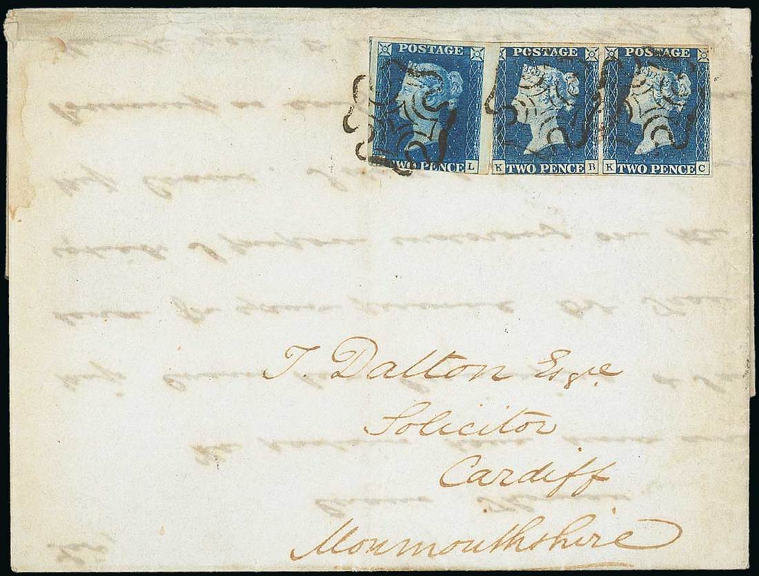 KB-KC horizontal pair, SL, very large margins to slightly cut into and showing portions of two adjoining stamps, tied by black Maltese Cross cancellations to entire letter dated 10 April 1841, from London to Cardiff, dated markings on reverse; vertical filing fold clear of the adhesives. A very scarce 6d. franking. Photo