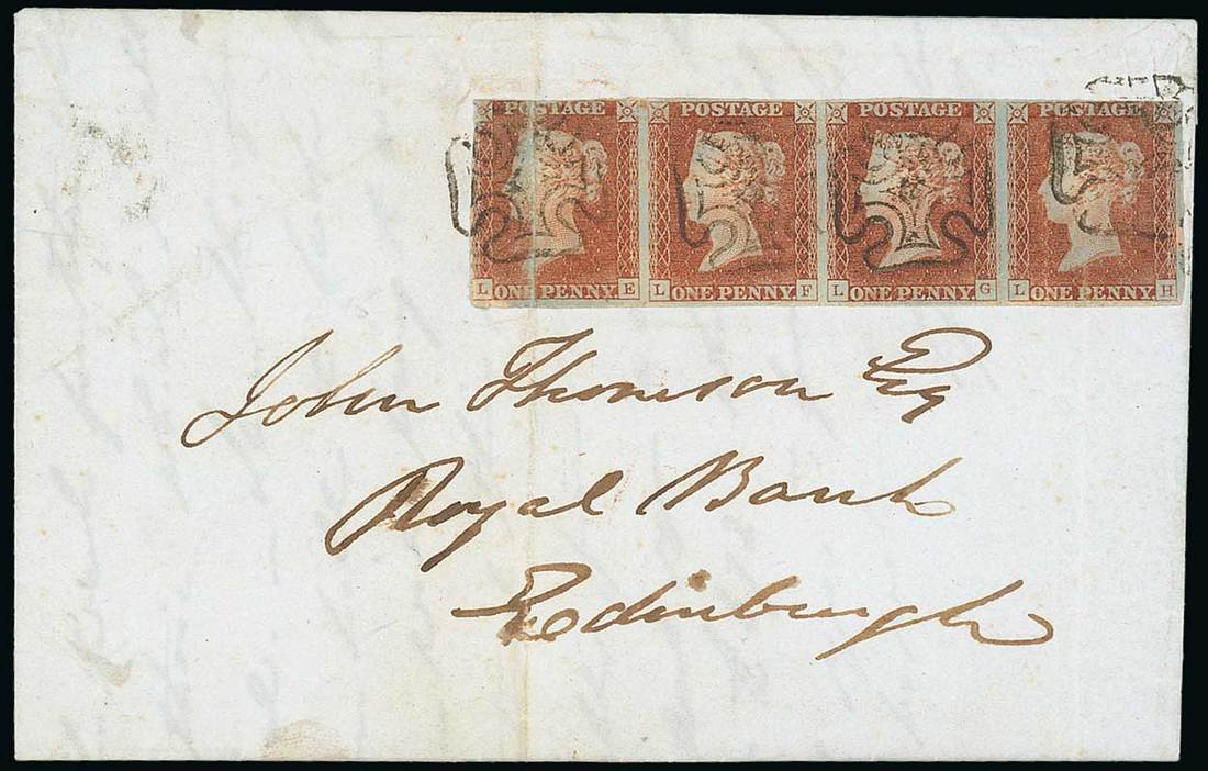 Plate 2: LE-LH horizontal strip of four, LE constant variety, tied by four crisp Greenock distinctive Maltese Cross cancellations to entire letter, dated 11 Feb. 1842 to Edinburgh; touched or cut into at places, LE and LH affected by vertical filing folds. Despite faults a very scarce multiple. Photo