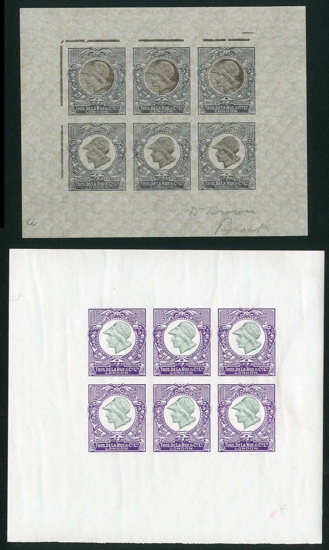 Large format sheetlet of six (3x2) on gummed chalk-surfaced paper, in violet and magenta, green and red, green and orange and green and violet, all with white background to head and a further sheet in brown and black on thin gummed paper with some Jubilee lines and the upper row having lined background. An attractive group