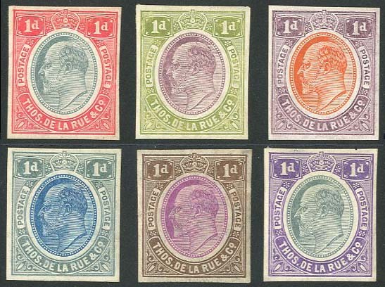 Small head 1d. bi-coloured proofs (6), in green and violet, blue and green, magenta and brown, green and red, pale lilac and olive-green, an orange and lilac, all on gummed MCA paper, variously numbered on reverse; two with faults though all of fine appearance