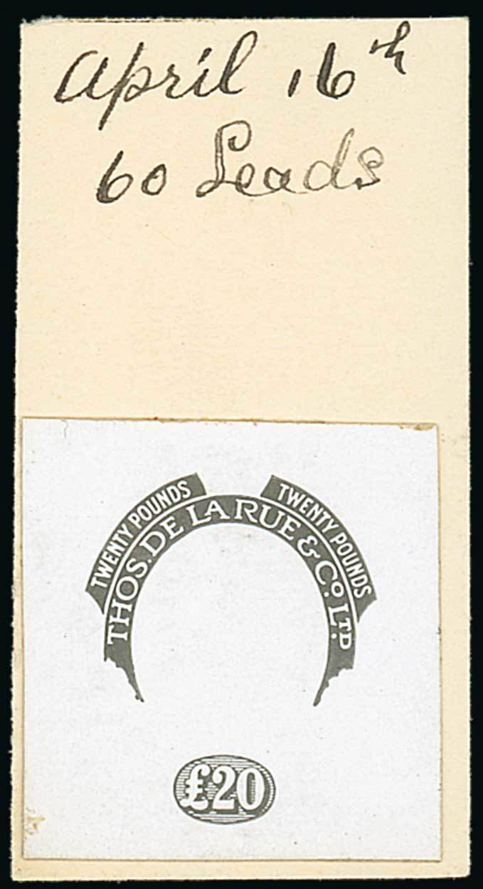 £20 proof on the value and "thos de la rue & co ltd" inscription, stamp-size on day book proof dated "(19)19" on reverse, plate proofs of the complete design inscribed "oversea dominions" in red, violet and a corner block of four in green; fine and most attractive. Also seven our company labels. Photo