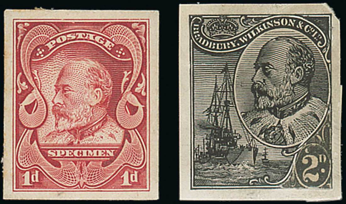 King Edward VII 1d. engraved proof in red inscribed "postage/specimen", and 2d. Battleship surface printed proof in black with the value tablet paste in place, thin in one corner though most unusual; also Company New Malden building label. Photo