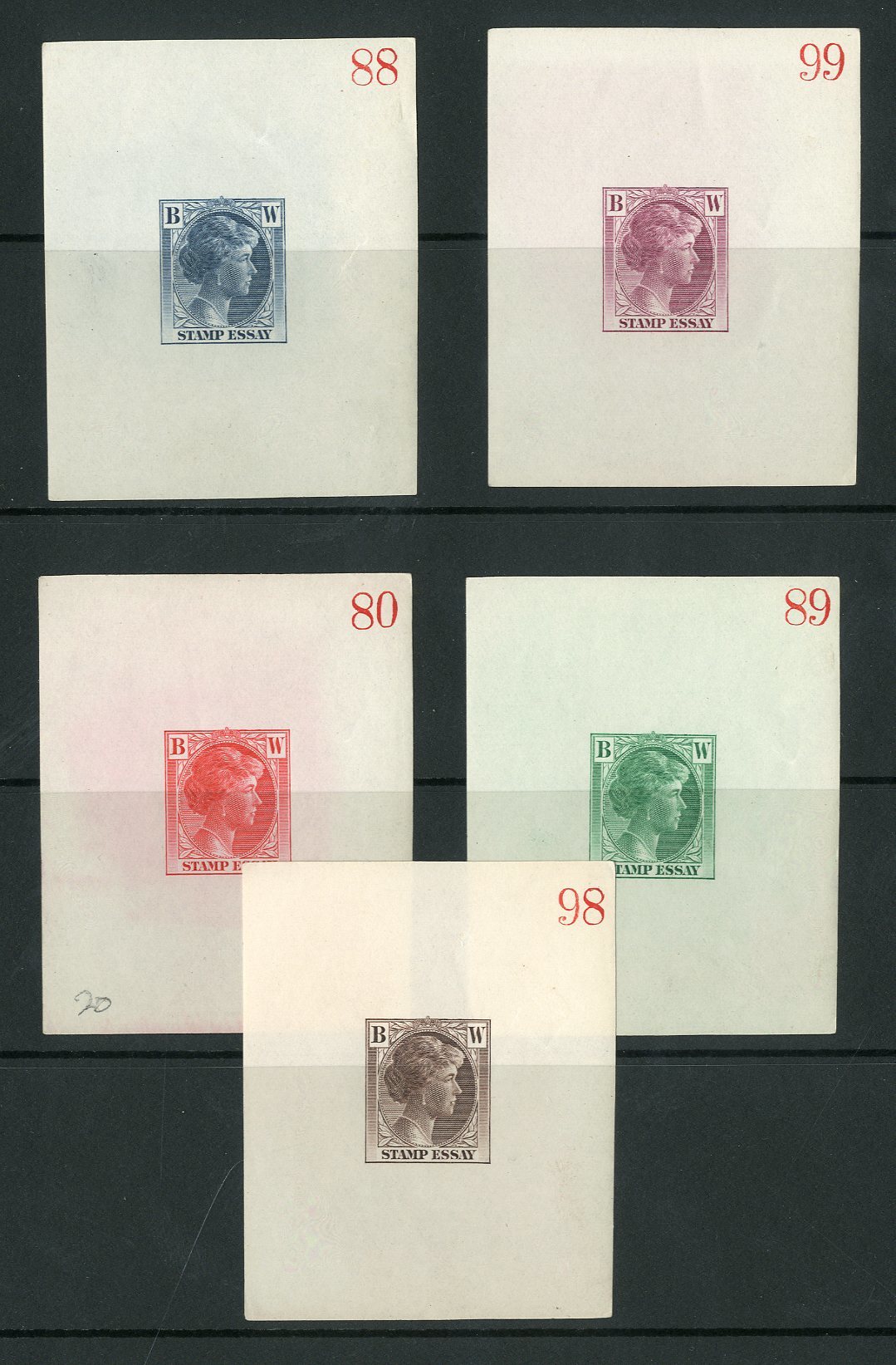 Grand Duchess Charlotte design inscribed "stamp essay, die proofs (5) on gummed paper (58x70mm.) in a variety of colours with each numbered in the upper right corner. A most attractive group