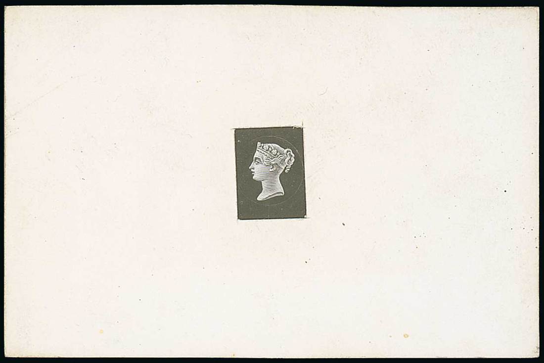1875 small head with uncleared surround, in black on glazed card (92x60mm.) and covered with a card leaving the design shown as rectangular. Photo