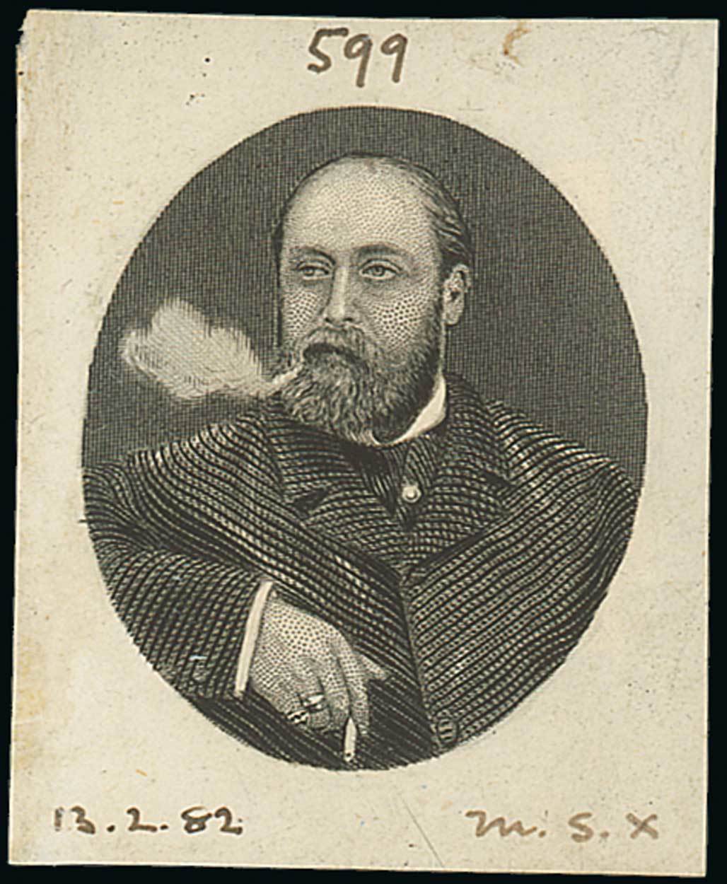 599, Edward, Prince of Wales, half-length portrait and blowing out a large plume of cigarette smoke, dated "13.2.82" and initialled "M.S.X.". Photo