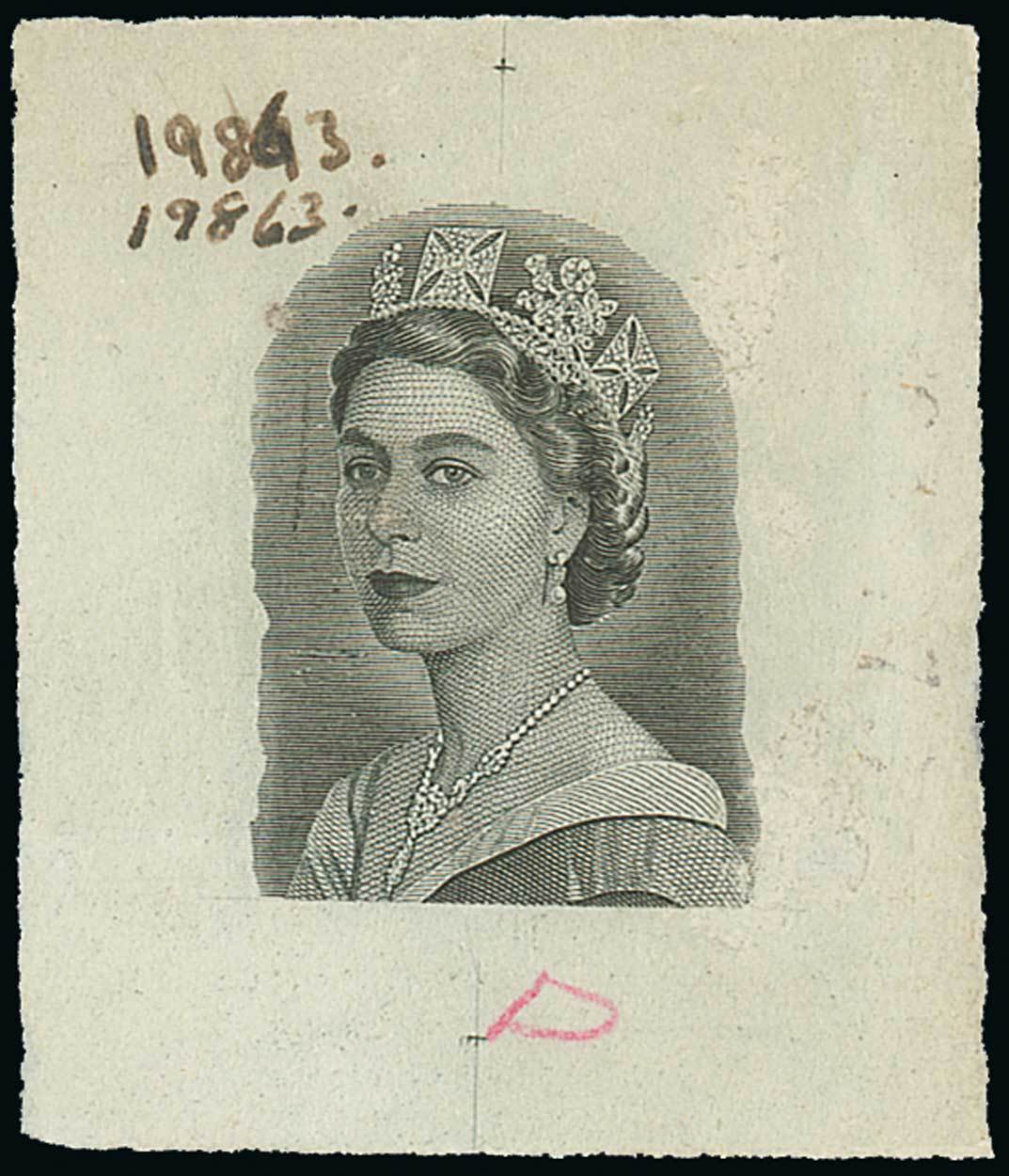 19863, an unusual portrait in in arch-shaped horizontal lined background, very similar to the Wilding portrait; light crease and surface abrasion. Photo