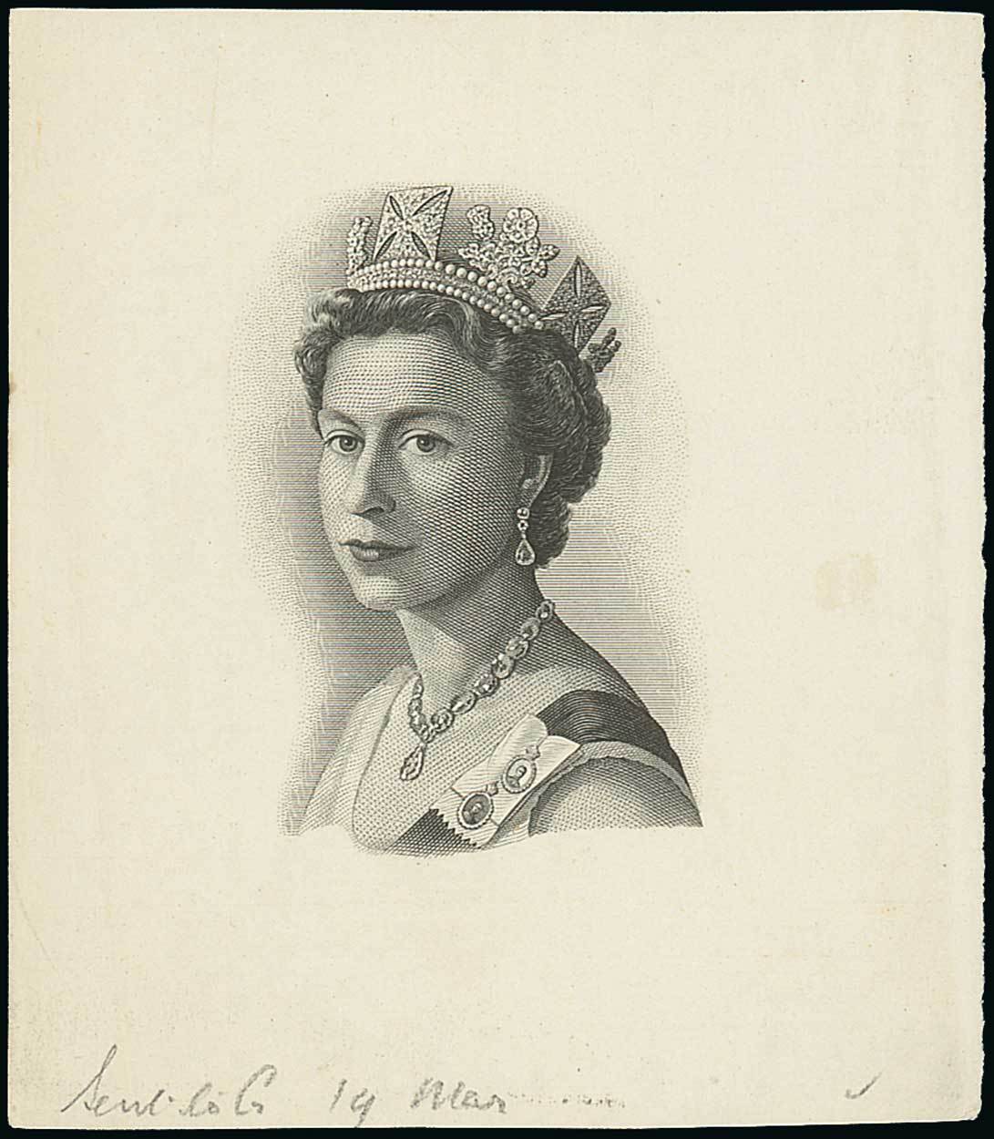 Un-numbered, young crowned head facing half left and with lightly engraved irregular-shaped background, marked "Sent to Cr. 19 Mar" in pencil at foot. A delightful portrait. Photo
