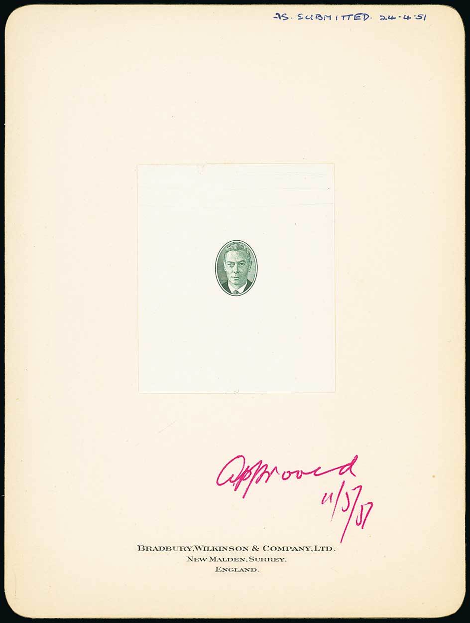 Later portrait with collar and tie in framed oval with horizontal lined background, examples in blue, brown and green, each 47x57mm.) and mounted on individual presentation cards marked "as submitted 24.4.51" and subsequently marked "Approved 11/5/51". A wonderful trio. Photo