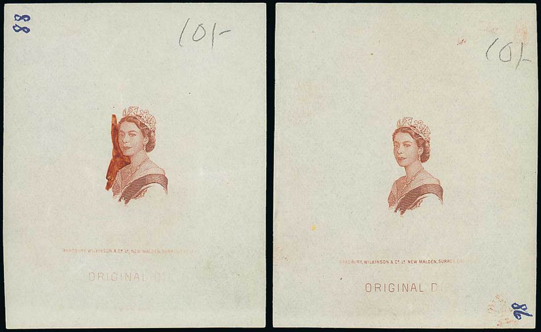 Young crowned head and shoulders portrait facing half left without background, examples in different shades of brown on gummed wove paper with imprint at foot and numbered "88" and "98", "88" with some handpainting to left of head, probably suggesting background. Photo