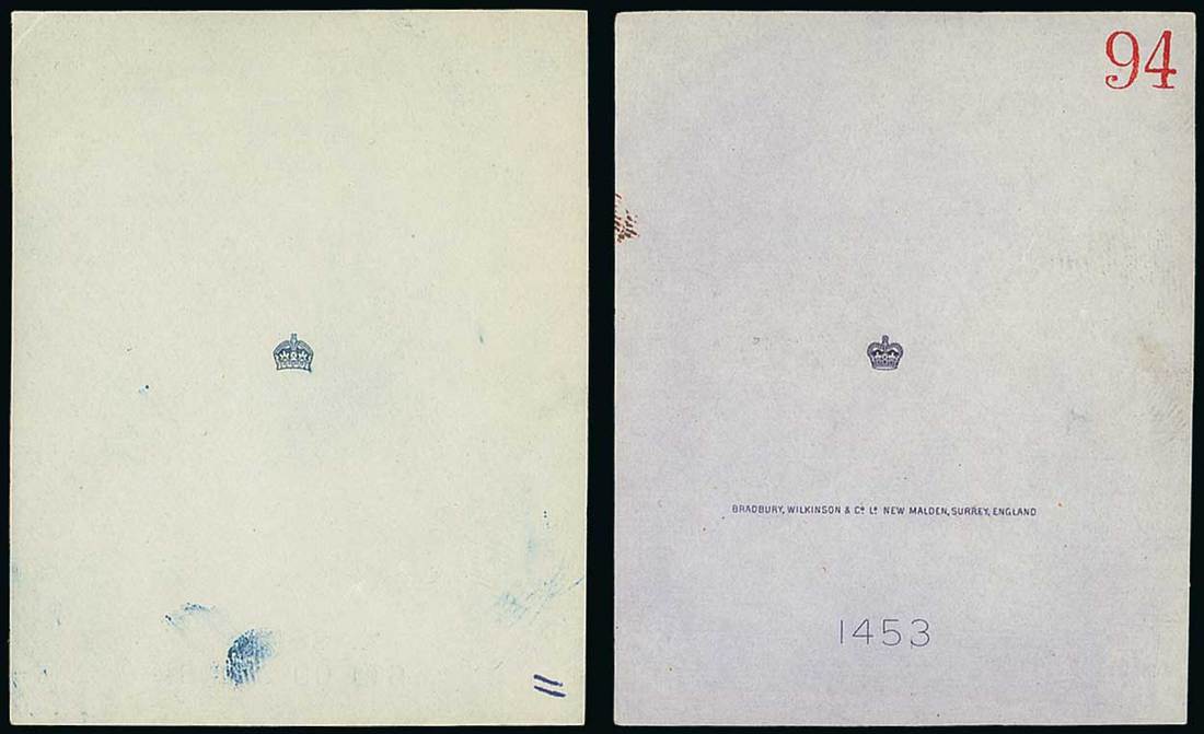 Tudor Crown in blue and St. Edward's Crown in violet, both on gummed wove paper, the first numbered "11", the second with imprint, die number "1453" and handstamped "94" in red ink at top. Photo