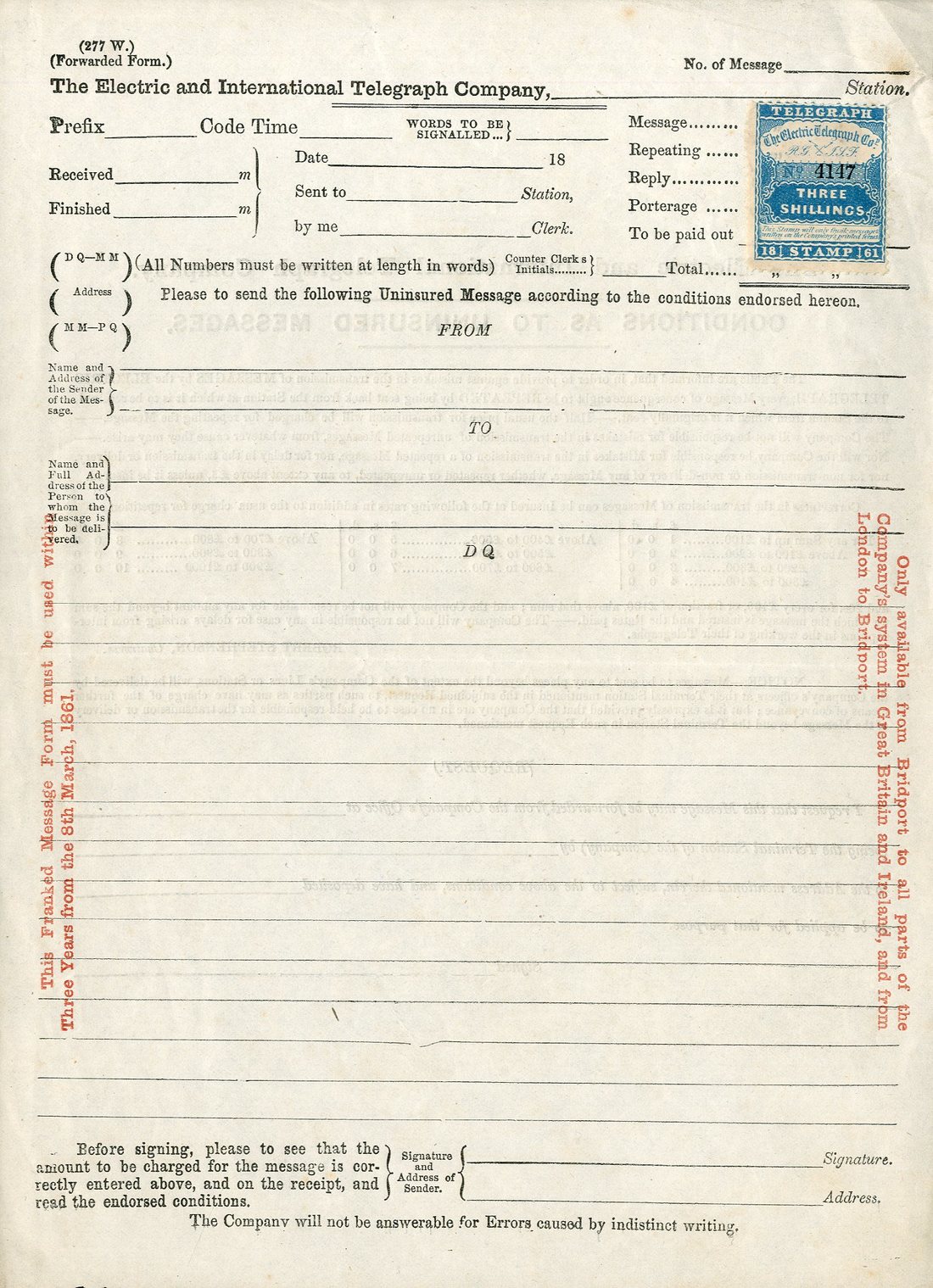 1861 unused forwarding form "277W" bearing 3/- blue perf. 12, endorsed at left; "Only available from Bridport to all parts of the Company's system in Great Britain and Ireland, and from London to Bridport". trivial tone spots at upper right though attractive and scarce, with only six forms recorded.