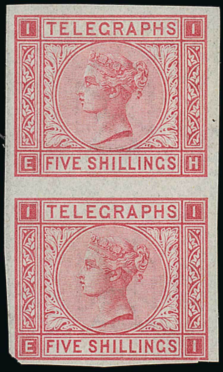 1876 5/- rose, plate 1, EH-EI, imperforate imprimatur vertical pair, mint, lower stamp with crease, closed tear and clipped at foot, nevertheless a fresh and appealing pair, illustrated in H.T. Jackson (1972). R.P.S. Certificate (1999). S.G. L231, £1,600. Photo