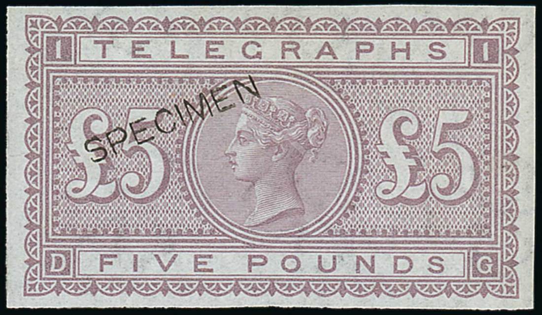 1876 £5 imperforate colour trial in dull mauve, DG, overprinted "specimen" type 8, fresh and fine mint. S.G. L237, £1,300. Photo