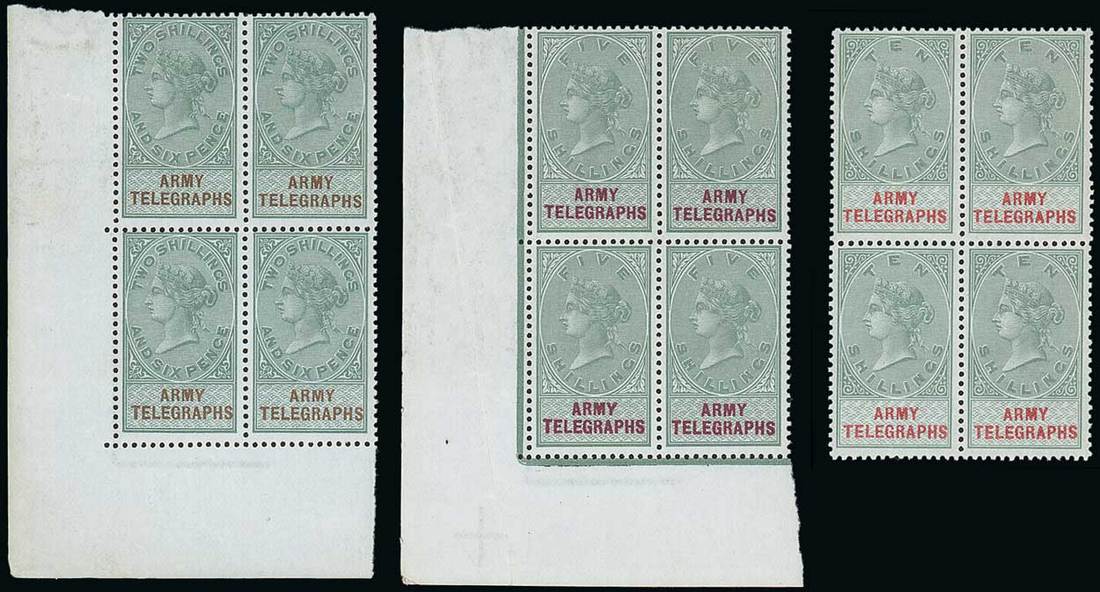1899-1900 1d. to 10/- part set in blocks of four comprising 1d., 2d., 6d., 1/-, 2/6d., 5/- and 10/- values, beautifully fresh gum and colour, with one or two stamps in each block mounted, all but the 1/- and 10/- blocks lower left corner marginal. Some creasing though a fine and remarkable assembly. S.G. AT3-AT11, £1,400+ Photo for 2/6d. to-10/-