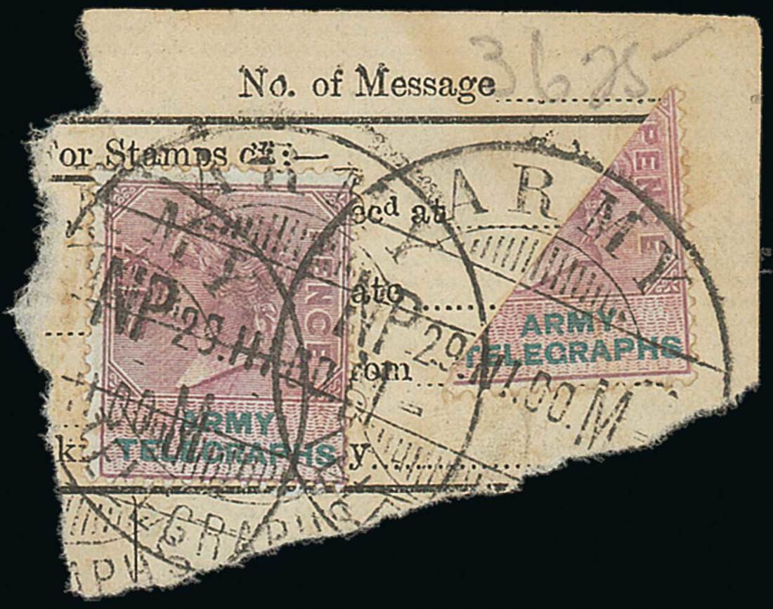 6d. lilac and green, (2), including one bisected, tied to small piece, with "NP-M" c.d.s. dated "29.III.00", piece with creasing and punch holes. Scarce. S.G. AT6a, £275. Photo