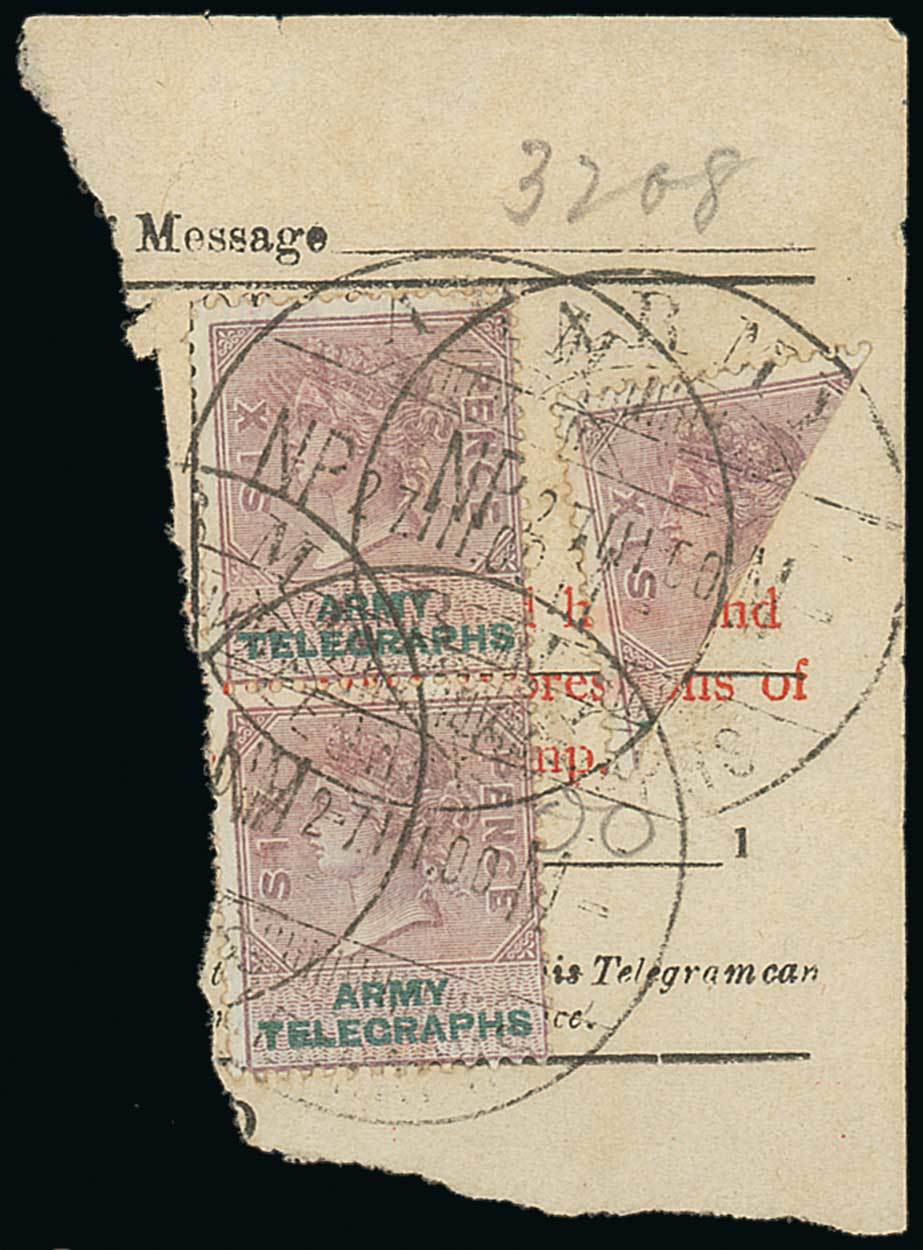 6d. lilac and green, (3), including one bisected, tied to small piece, with "NP-M" c.d.s. dated "27.III.00", piece with creasing and punch holes. Fine and scarce. S.G. AT6a, £275. Photo