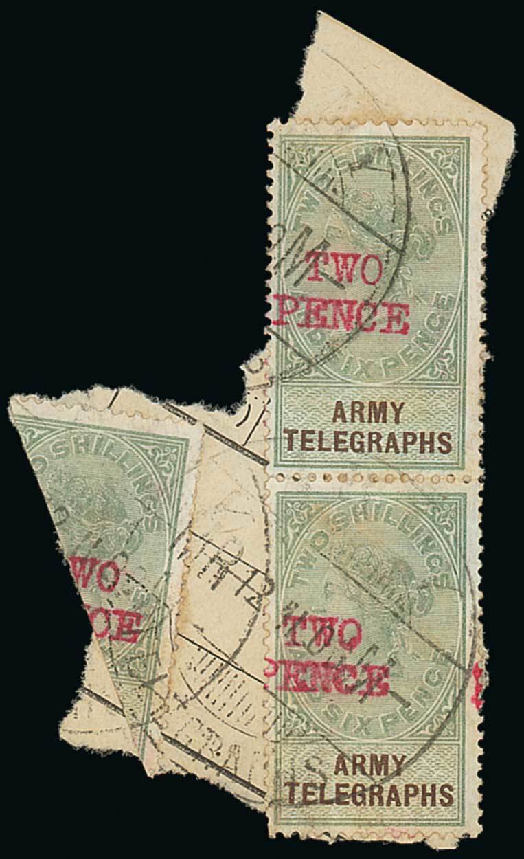 1900 Provisional overprint 2d. on 2/6 green and brown, vertical pair and diagonal bisect tied to small fragment by "mr-m" (Modder River) cancellations dated "12.II.00". Faintly soiled though extremely scarce. S.G. AT14/a, £570. Photo
