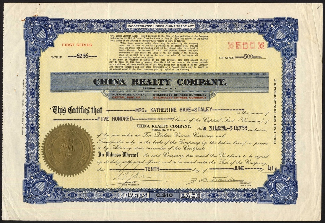 China Realty Co. (Fed. Inc. U.S.A.), $10 shares, Chinese currency, 19[41], #6256, ornate border, blue and black, yellow underprint, gold seal. AVF.