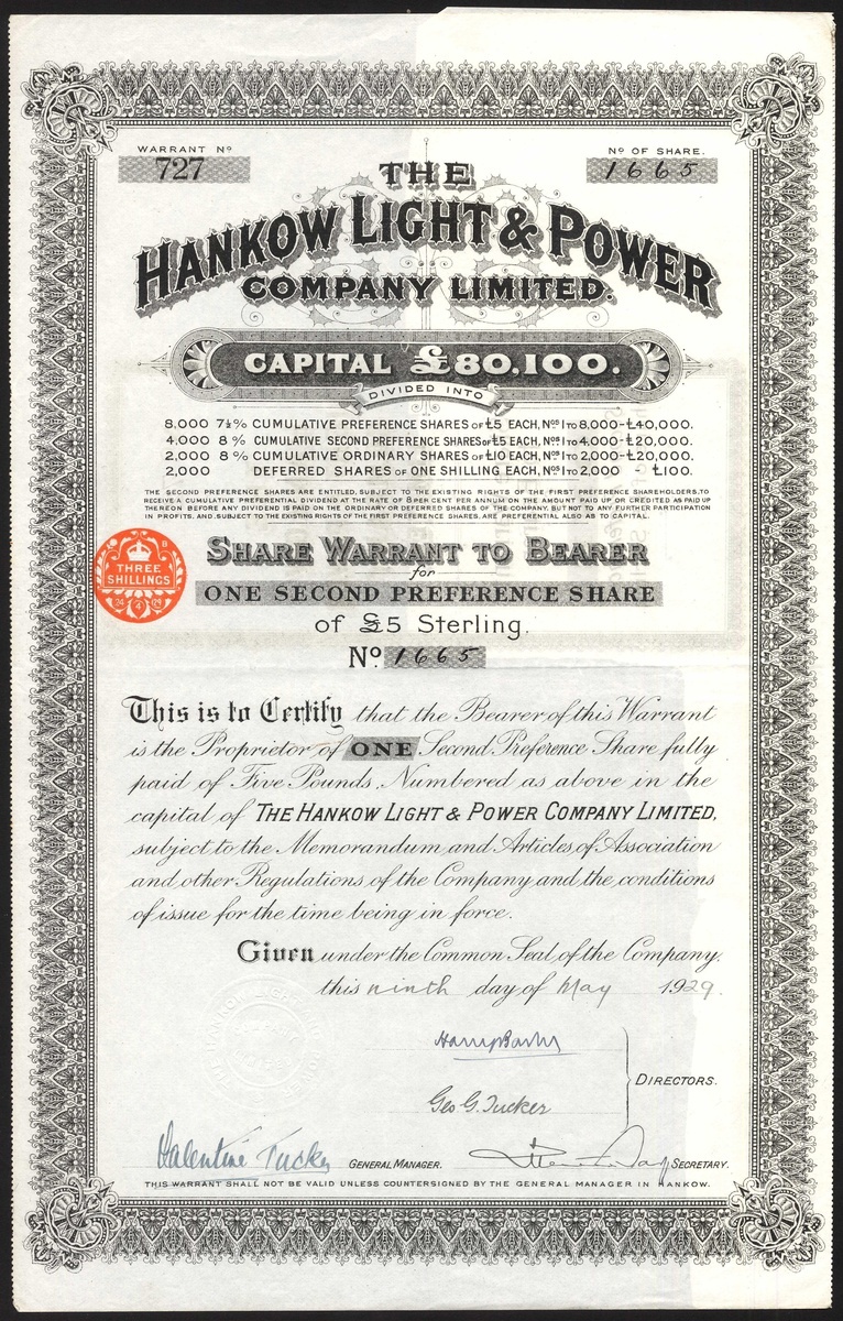 Hankow Light & Power Co. Ltd., one second preference share of £5, 19[29], #727, ornate border, black, weith coupons. An English company providing electric light to the Russian, British and French concessions in the city. VF