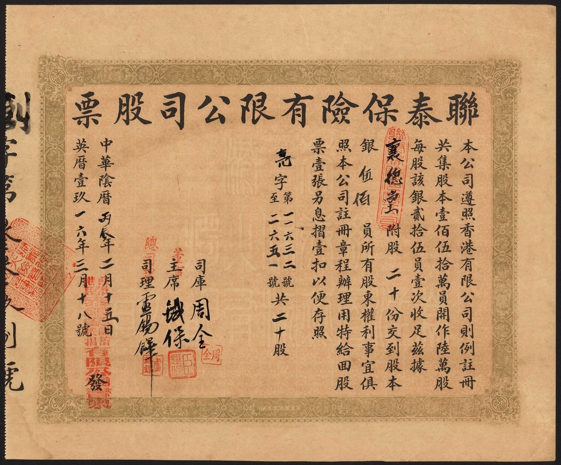 Lun Tai Mutual Fire & Marine Insurance Co. Ltd., $25 shares, 19[16], #11632-11651, green and black, text in Chinese with English translation on the reverse. Incorporated in Hong Kong in 1911, dissolved in 2010! AEF
