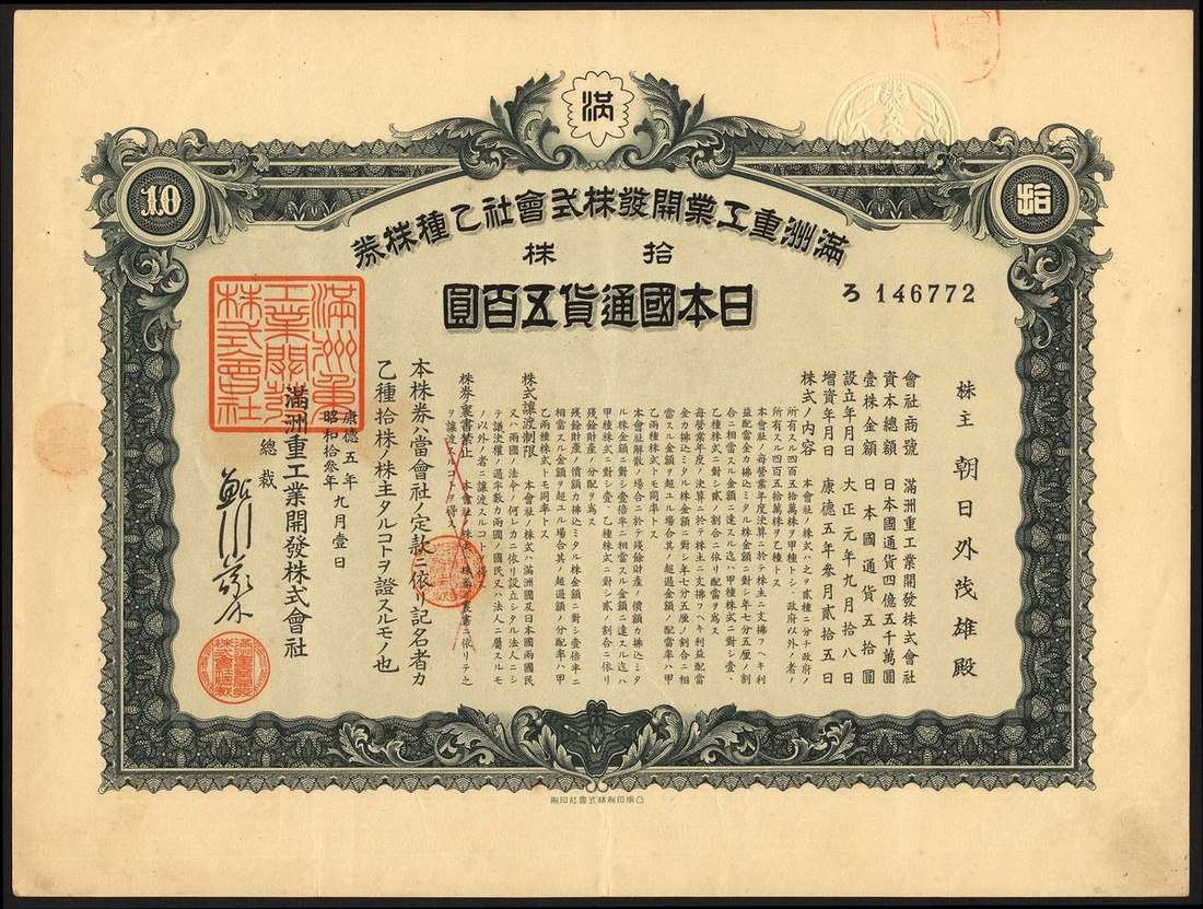 (x) Manchurian Heavy Industry Company, a group of 3 certificates for 10 shares of 50 yean, logo at top, ornate border, dark blue-green, together with a later issue of 10 shares of 50 yen, ornate border, purple. VF (4)