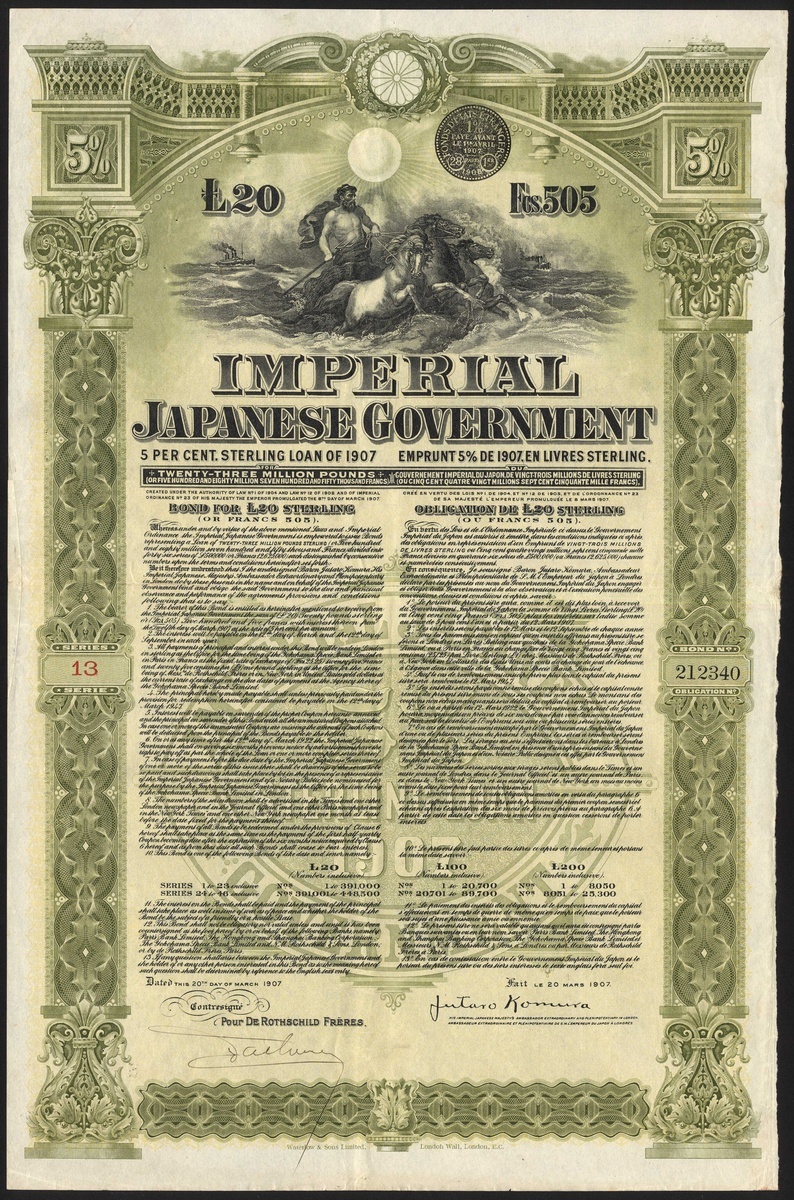 Imperial Japanese Government, 5% Loan 1907, bond for £20 or 505 francs, countersigned by Rothschild, #212340, large format piece with vignette of Neptune rising from the sea, green and black, text in English and French, printed by Waterlow & Sons, with coupons. VF and scarce.