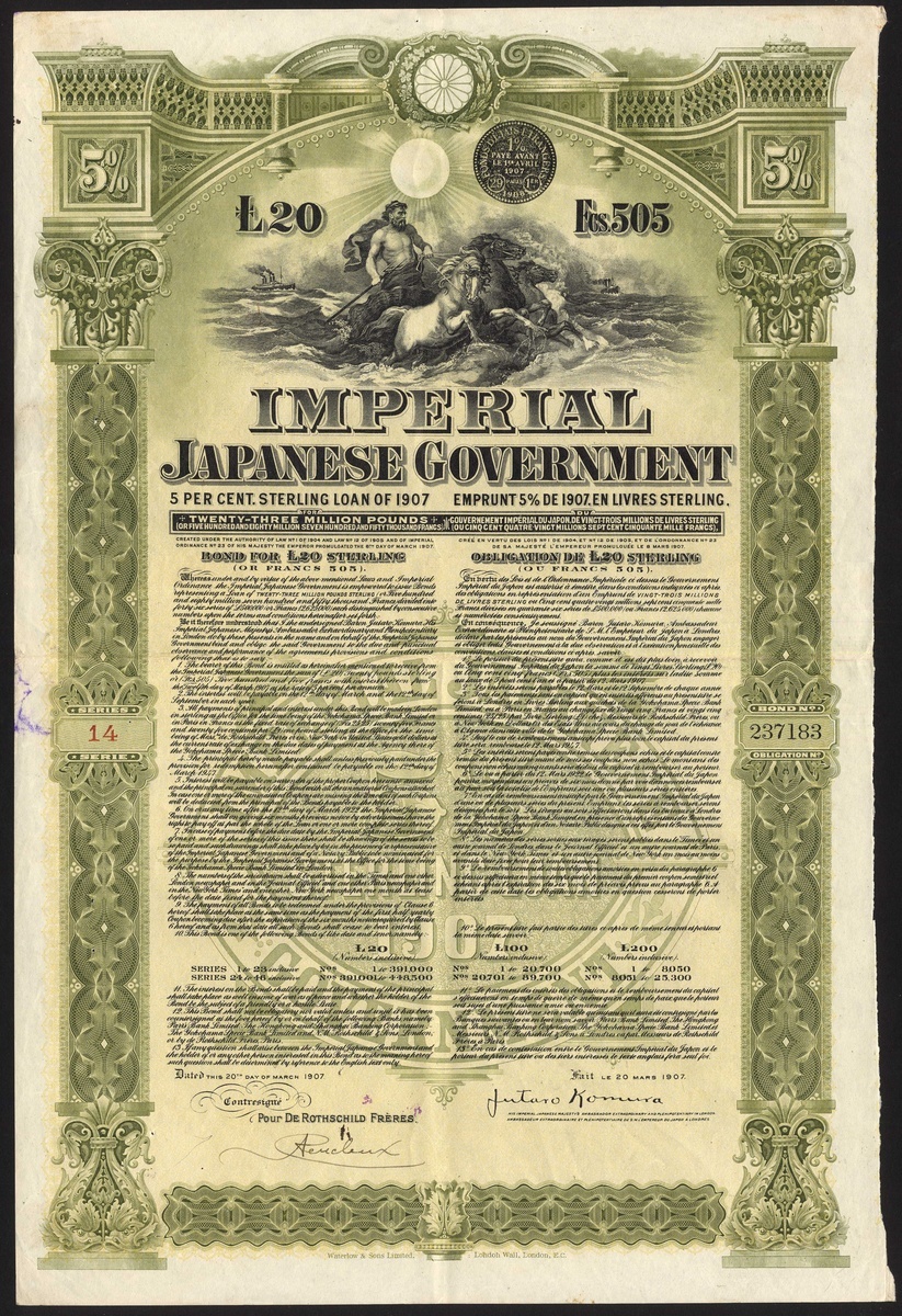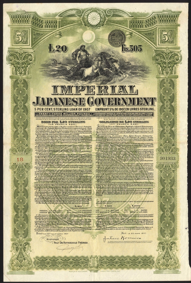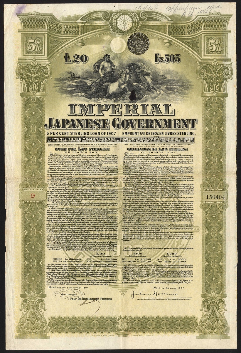 Imperial Japanese Government, 5% Loan 1907, a group of 3 bonds for £20 or 505 francs, countersigned by Rothschild, #301933, 237183, 150504, large format pieces with vignette of Neptune rising from the sea, green and black, text in English and French, printed by Waterlow & Sons, with coupons. the last with ink smudge otherwise VF and scarce (3).