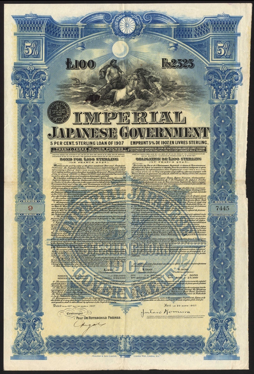 Imperial Japanese Government, 5% Loan 1907, bond for £100 or 2525 francs, countersigned by Rothschild, #7445, large format piece with vignette of Neptune rising from the sea, blue and black, text in English and French, printed by Waterlow & Sons, with coupons. VF and rare.