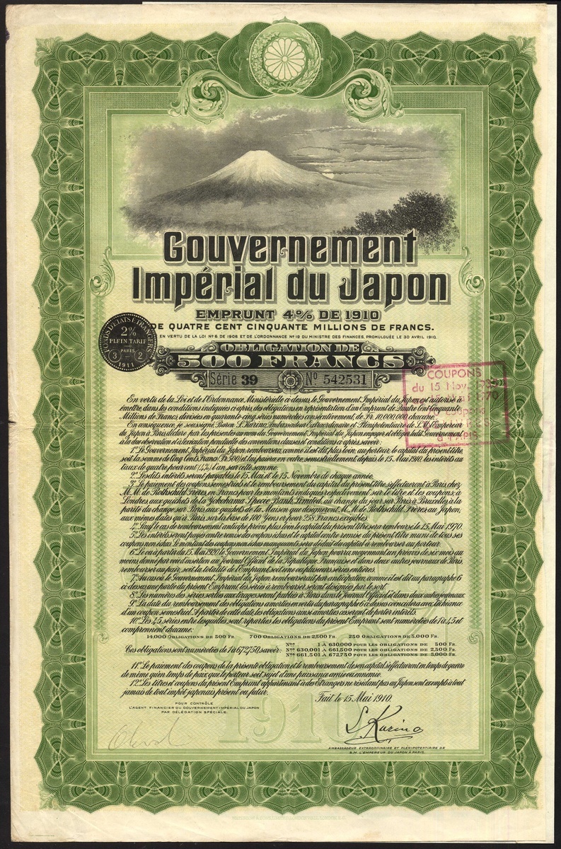 Imperial Japanese Government, 4% Loan, 1910, bond for 500 francs, no.542531, Mount Fuji at top, ornate border, green and black, printed by Waterlow & Sons, with coupons. VF.